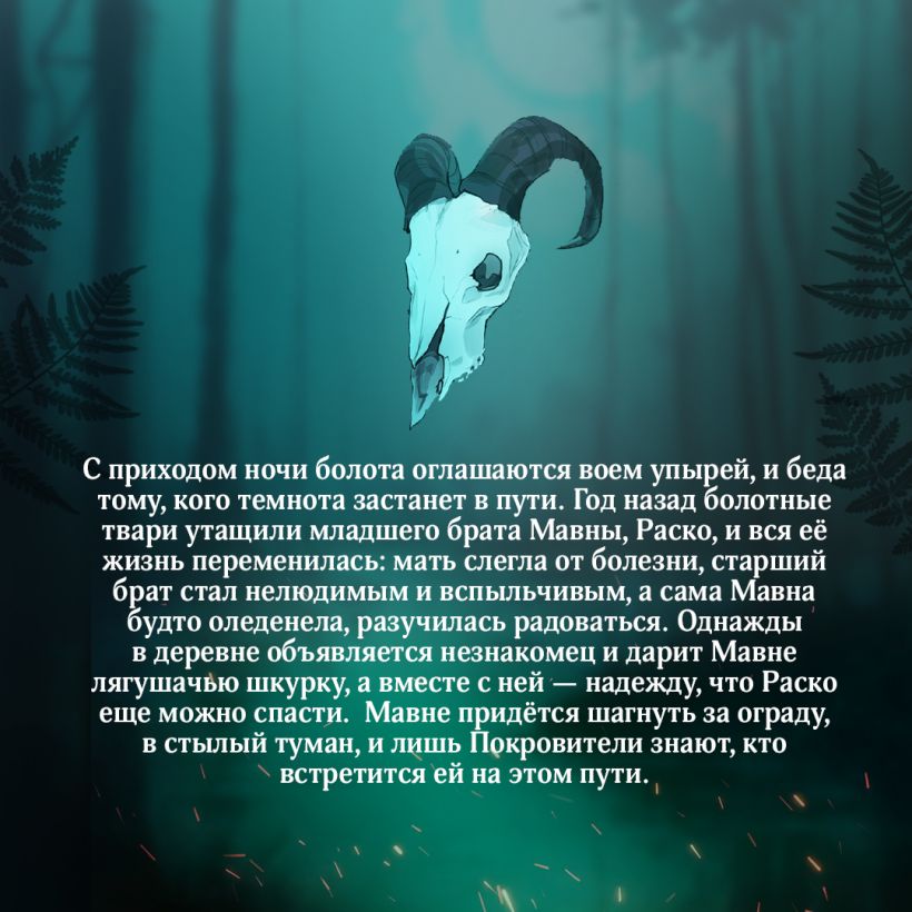 Повстречаются на пути и другие герои, об истинных мотивах которых остается лишь гадать на свечном воске, подобно одной из обитательниц Сонных Топей. Незнакомец, поймавший венок, и нелюдимый чародей — какую роль им предстоит сыграть в Мавниной судьбе?