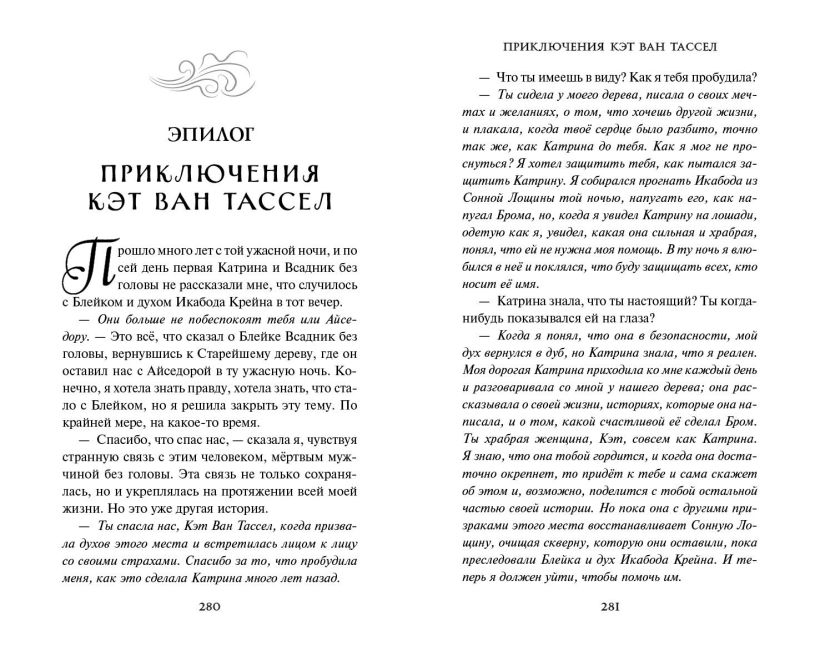 Вас ждёт целых две сюжетные линии, связанные тайной! Много лет назад Катарина ван Тассел описала в своём дневнике легенду о Всаднике без головы и Икабоде Крейне. Спустя 200 лет её внучка Кэт читает дневник и обнаруживает, что её жизнь как две капли воды похожа на жизнь предшественницы. Кэт ждёт встреча с призраками, тайной своей семьи, собственными страхами и… новой любовью.