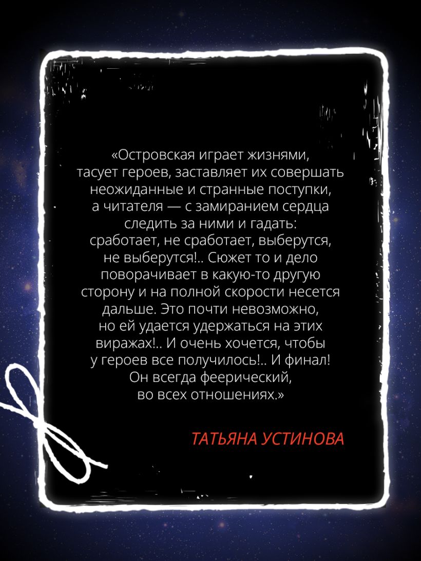 Татьяна Устинова рекомендует: «Островская играет жизнями, тасует героев, заставляет их совершать неожиданные и странные поступки, а читателя — с замиранием сердца следить за ними и гадать: сработает, не сработает, выберутся, не выберутся!.. Сюжет то и дело поворачивает в какую-то другую сторону и на полной скорости несется дальше. Это почти невозможно, но ей удается удержаться на этих виражах!.. И очень хочется, чтобы у героев все получилось!.. И финал! Он всегда феерический, во всех отношениях».