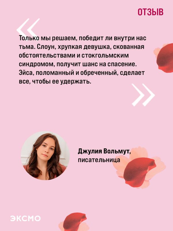 «Только мы решаем, победит ли внутри нас тьма. Слоун, хрупкая девушка, скованная обстоятельствами и стокгольмским синдромом, получит шанс на спасение. Эйса, поломанный и обреченный, сделает все, чтобы ее удержать». – Джулия Вольмут, писательница