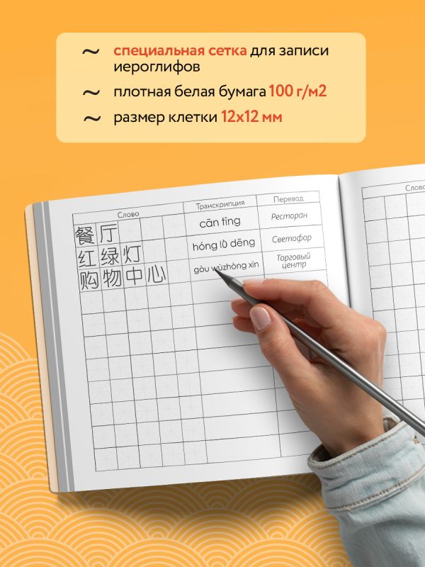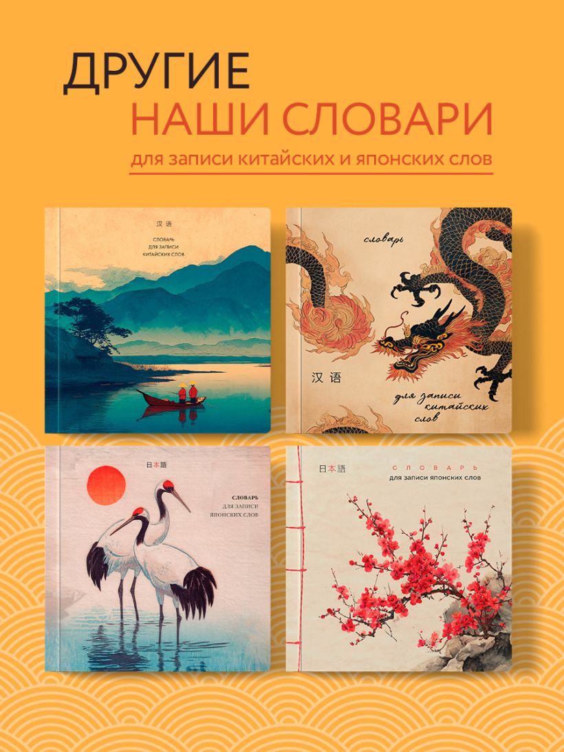 Серия словарей для записи азиатских слов служит полезным помощником при изучении восточных языков. Специальная сетка для записи иероглифов поможет аккуратно записать слово в ячейках первой колонки; рядом предусмотрены колонки для транскрипции и перевода. Повторяйте новую лексику, закрывая нужное рукой или листом бумаги.