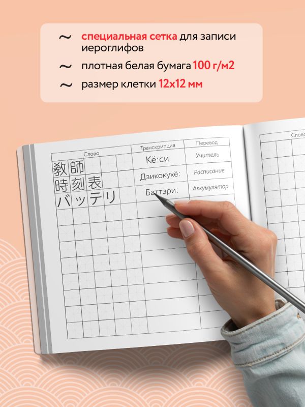 Серия словарей для записи азиатских слов служит полезным помощником при изучении восточных языков. Специальная сетка для записи иероглифов поможет аккуратно записать слово в ячейках первой колонки; рядом предусмотрены колонки для транскрипции и перевода. Повторяйте новую лексику, закрывая нужное рукой или листом бумаги.