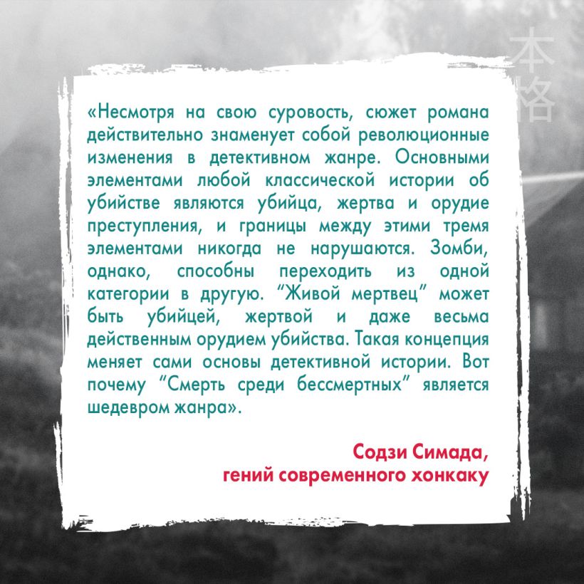«Несмотря на свою суровость, сюжет романа действительно знаменует собой революционные изменения в детективном жанре. Основными элементами любой классической истории об убийстве являются убийца, жертва и орудие преступления, и границы между этими тремя элементами никогда не нарушаются. Зомби, однако, способны переходить из одной категории в другую. “Живой мертвец” может быть убийцей, жертвой и даже весьма действенным орудием убийства. Такая концепция меняет сами основы детективной истории. Вот почему “Смерть среди бессмертных” является шедевром жанра». — Содзи Симада, гений современного хонкаку
