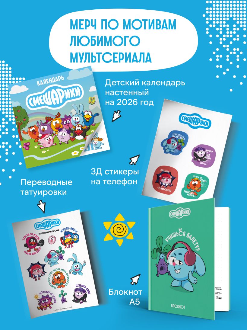 Говорят, ты раскис? Побалуй своего внутреннего ребенка! Бараш, Копатыч, Крош и Нюша специально для этого примерили на себя новые образы. Задай стиль своему телефону с помощью объемных стикеров. В наборе 5 стикеров, залитых смолой. 3D-наклейки располагаются на подложке. Набор упакован в целлофановый пакетик с евпроподвесом. 3D-стикеры на телефон — это отличный подарок себе, а также сестрам, братьям и детям на Новый год или на день рождения. Собери всю коллекцию «Смешариков»: «Смешарики. 3D-стикеры на телефон» «Смешарики. Наклейки» (24 наклейки на 2 листах) «Смешарики. Переводные татуировки» «Смешарики. Блокнот шалость удалась!» (формат А5, 128 стр., с цитатами и картинками) Детский календарь настенный на 2026 год. «Смешарики» (290х290 мм)