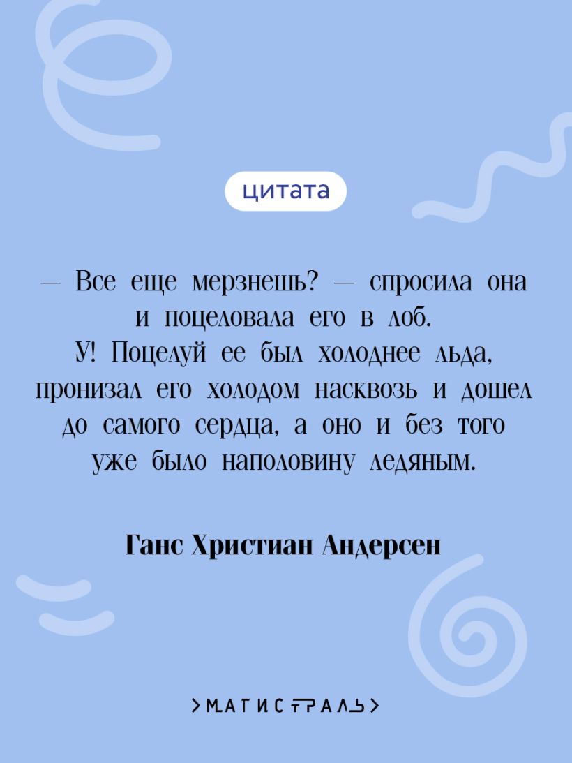 Так начинается сказка «Снежная королева». Мы послушаем, как дружбу маленьких детей, Кая и Герды, попыталась разрушить ледяная дама, королева вечного холода и поражающих осколков. Мы будем переживать все испытания храброго сердца Герды, которая отправилась искать Кая. Мы поймем в конце, что с надеждой и помощью добрых людей всегда есть шанс на спасение. Андерсен такой необычный сказочник, — он здорово готовит детей к взрослой жизни.