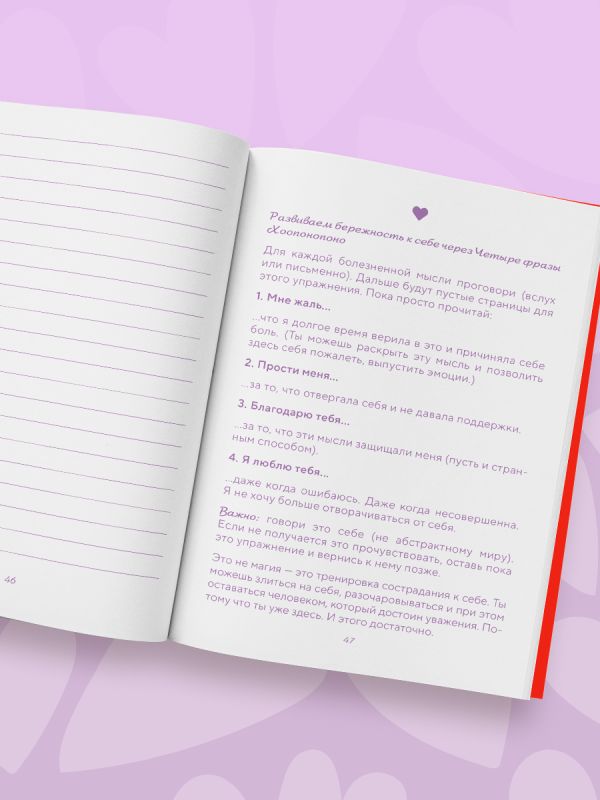 ✔ Практические упражнения — чтобы разобраться в своих страхах, убеждениях и эмоциях и научиться жить без постоянной самокритики.