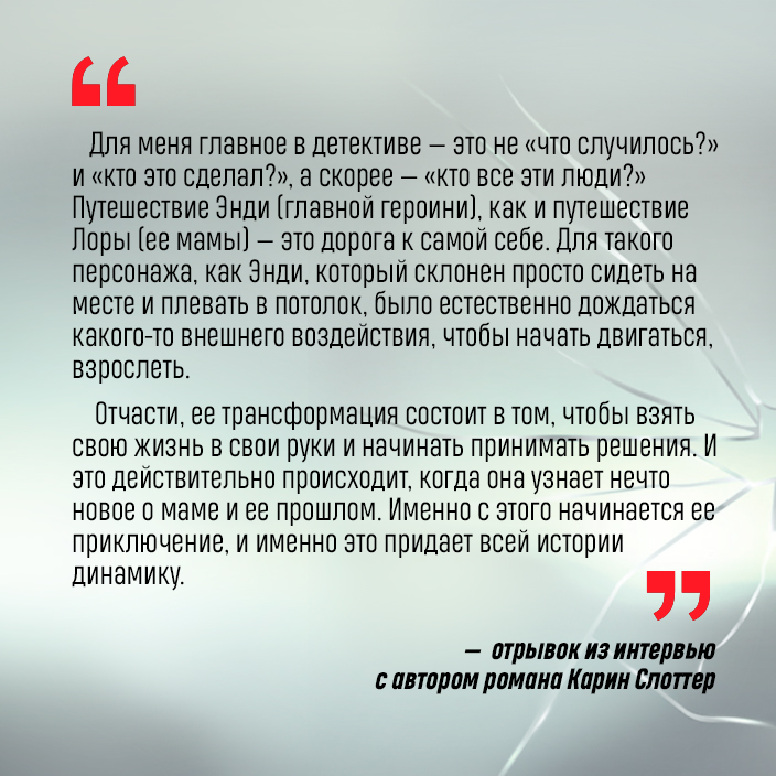 «Неизменно популярная писательница Карин Слотер возвращается с новым романом, где в центре событий оказываются запутанные отношения между матерью и дочерью». — Entertainment Weekly