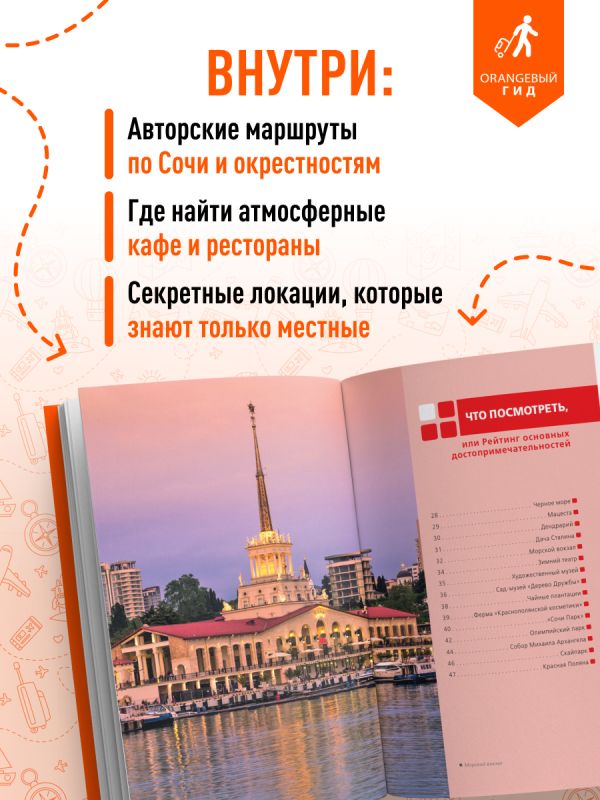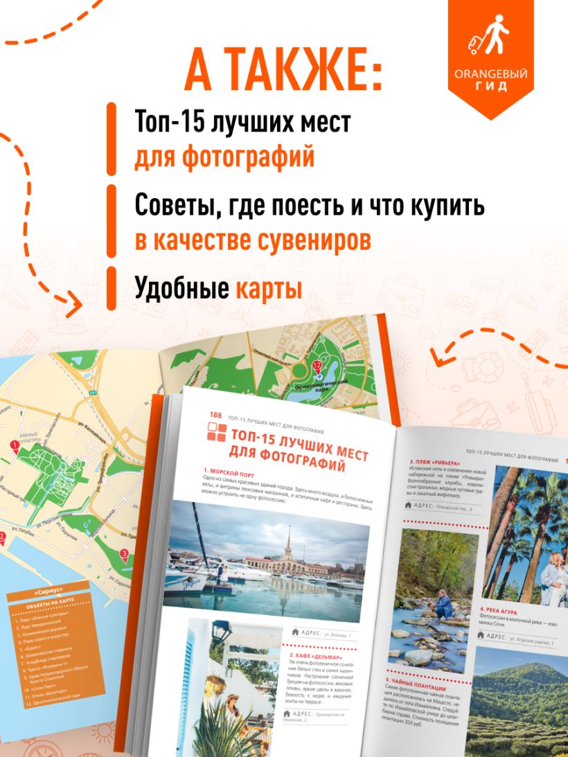 В нем содержится актуальная и полезная информация о Сочи, различные маршруты на любой вкус, подсказки, что делать, если идет дождь, или где искать лучшие смотровые площадки, а также множество полезных советов от автора Ирины Сущевой, которая является местным гидом и блогером. Сориентироваться на местности помогут удобные карты, расположенные на страницах путеводителя.