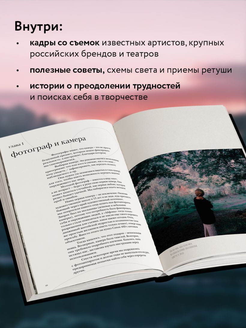 Закулисье и лайфхаки профессии «фотограф»: потрясающие снимки, авторские идеи и лайфхаки, интервью успешных российских фотографов и цитаты мировых звезд фотографии Автор книги — известный фотограф Анна Аристова. Ее работы выставлялась на Московской международном биеннале современного искусства и печатались в Vogue, GQ, Flacon, OK! и других легендарных изданиях Книга-наставник и книга-поддержка для тех, кто начинает свой путь в фотографии, а также море вдохновения для всех, кто ценит красоту и умеет не только смотреть, но и видеть