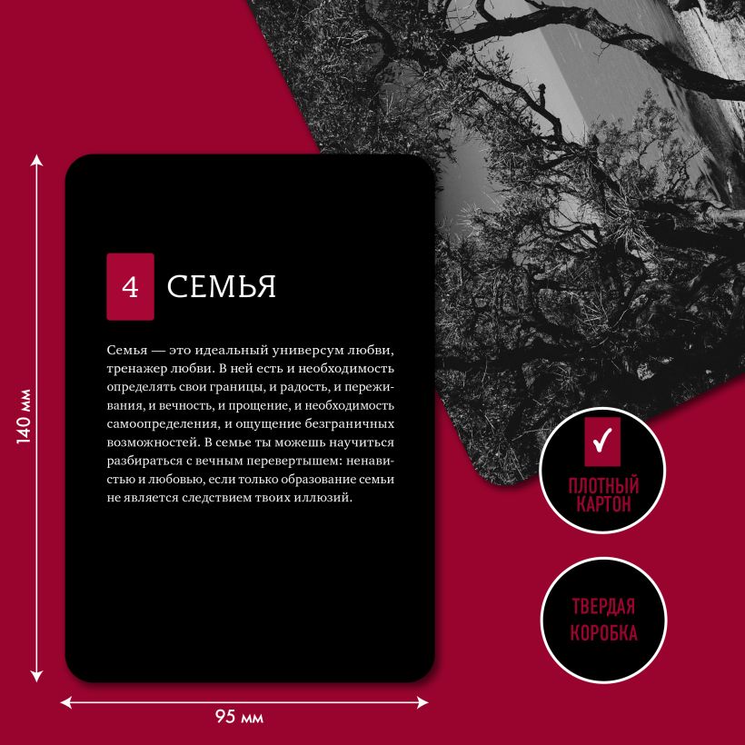 Колода метафорических карт дополняет содержание книги, предлагая читателю интерактивный способ взаимодействия с темами, обсуждаемыми в тексте. Эти карты могут стать полезным инструментом для саморазмышления и анализа своих эмоций, а также для более глубокого понимания отношений с окружающими.