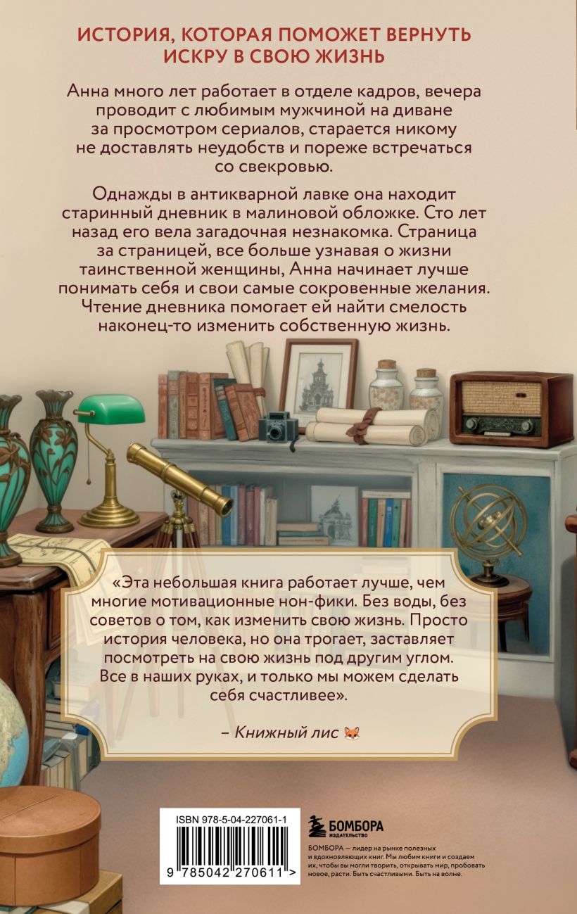 Анна много лет работает в отделе кадров, вечера проводит с любимым мужчиной на диване за просмотром сериалов, старается никому не доставлять неудобств и пореже встречаться со свекровью. Однажды в антикварной лавке она находит старинный дневник в малиновой обложке. Сто лет назад его вела загадочная незнакомка. Страница за страницей, все больше узнавая о жизни таинственной женщины, Анна начинает лучше понимать себя и свои самые сокровенные желания. Чтение дневника помогает ей найти смелость наконец-то изменить собственную жизнь.