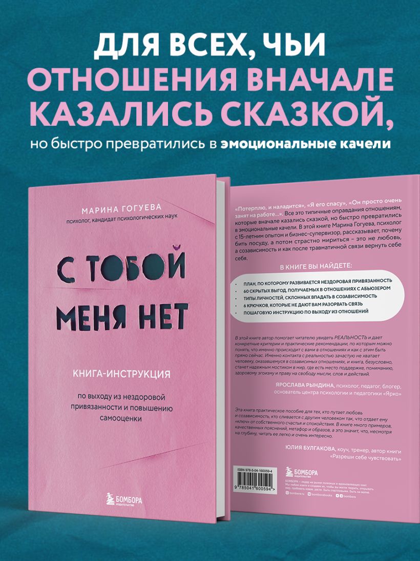 «Потерплю и наладится», «Я его спасу», «Он просто очень занят на работе…». Все это типичные оправдания отношениям, которые вначале казались сказкой, но быстро превратились в эмоциональные качели. В этой книге Марина Гогуева, психолог с 15-летним опытом и бизнес-супервизор, рассказывает, почему бить посуду, а потом страстно мириться — это не любовь, а созависимость и как после травматичной связи вернуть себе себя.
