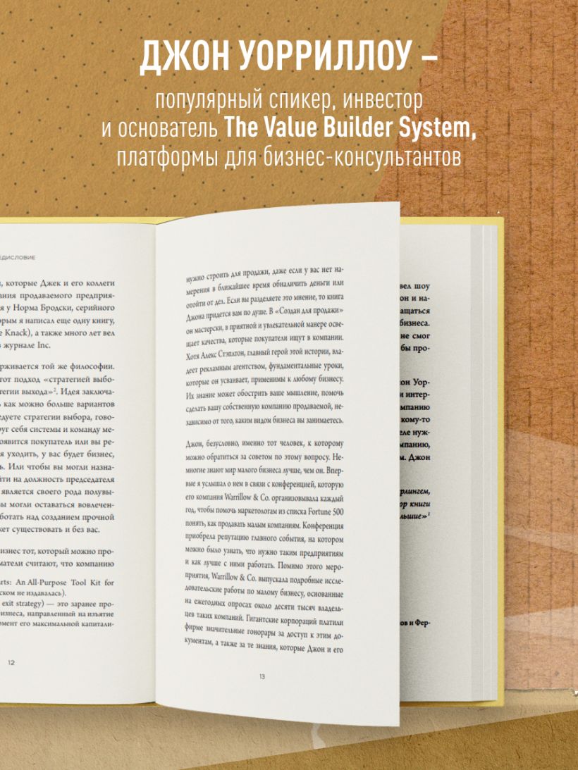 «Лучший бизнес тот, который можно продать!» — заявляет Джон Уорриллоу, один из ведущих американских маркетологов в сфере бизнеса. Он считает: главная ошибка предпринимателей — создание компании, которая слишком сильно зависит от них самих. Когда приходит время продажи, покупатели не уверены в том, что она может быть самостоятельной.