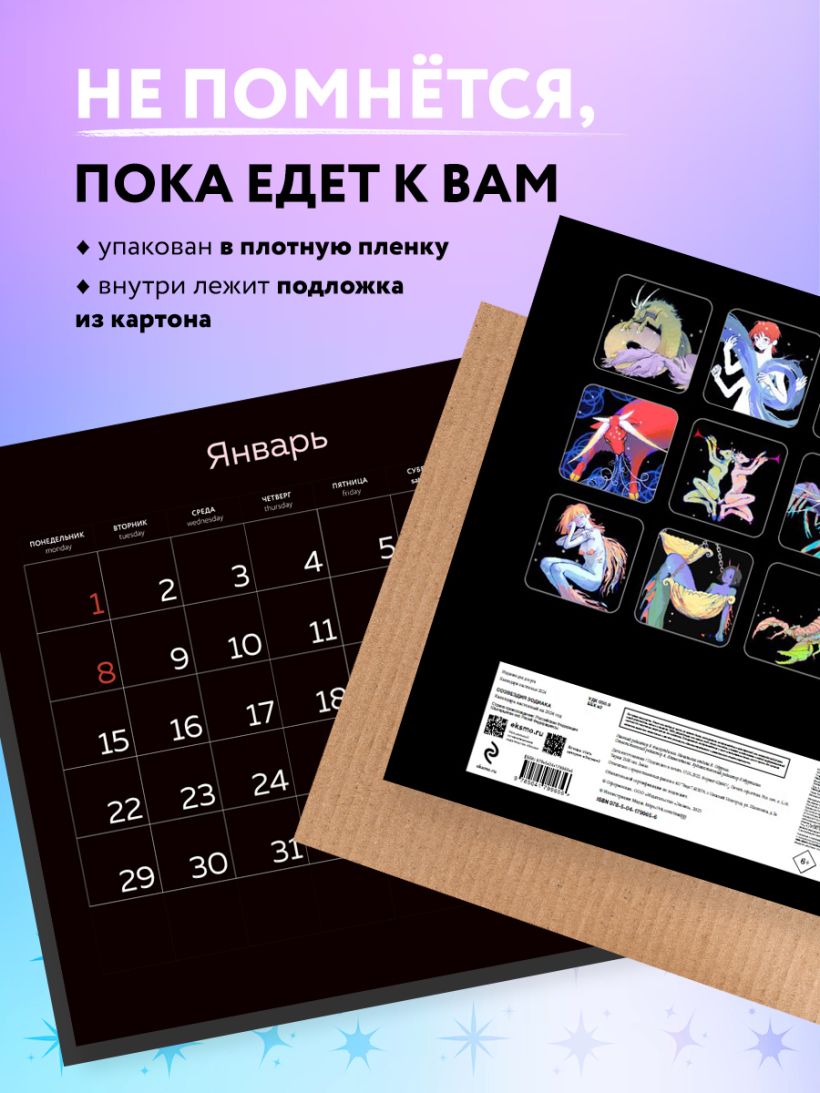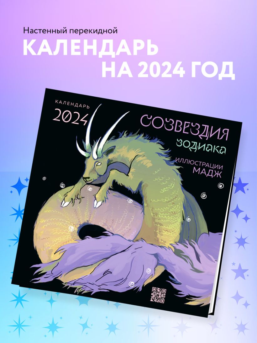 Календарь с ярким и загадочным дизайном. Иллюстрации с изображениями зодиакальных созвездий выполнены в авторском стиле художницы Мадж, за творчеством которой следят уже более 40 тысяч человек на ее странице ВКонтакте.