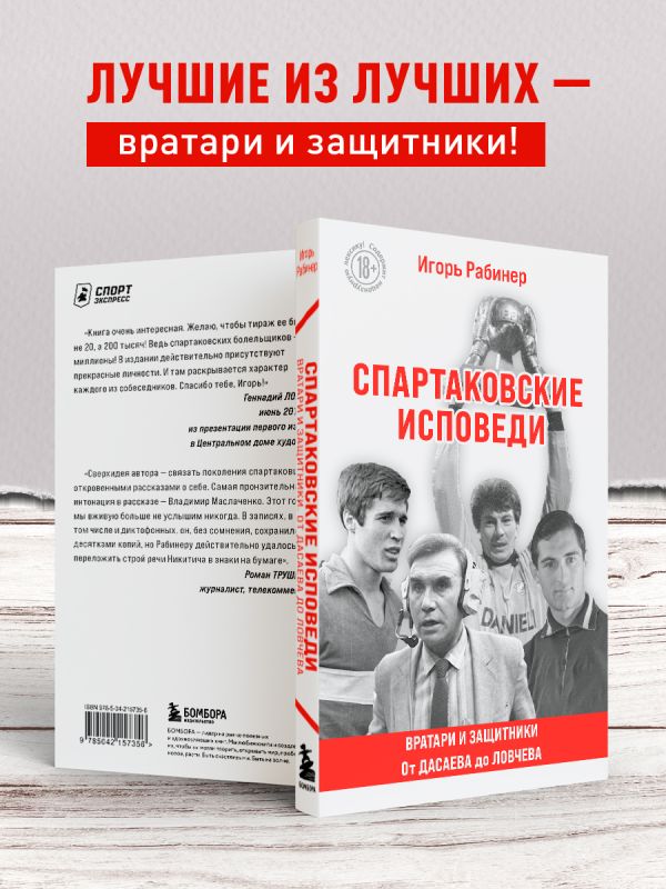 «Сверхидея автора — связать поколения спартаковцев откровенными рассказами о себе. Самая пронзительная интонация в рассказе — Владимир Маслаченко. Этот голос мы вживую больше не услышим никогда. В записях, в том числе и диктофонных, он, без сомнения, сохранился десятками копий, но Рабинеру действительно удалось переложить строй речи Никитича в знаки на бумаге». — Роман ТРУШЕЧКИН, журналист, телекомментатор