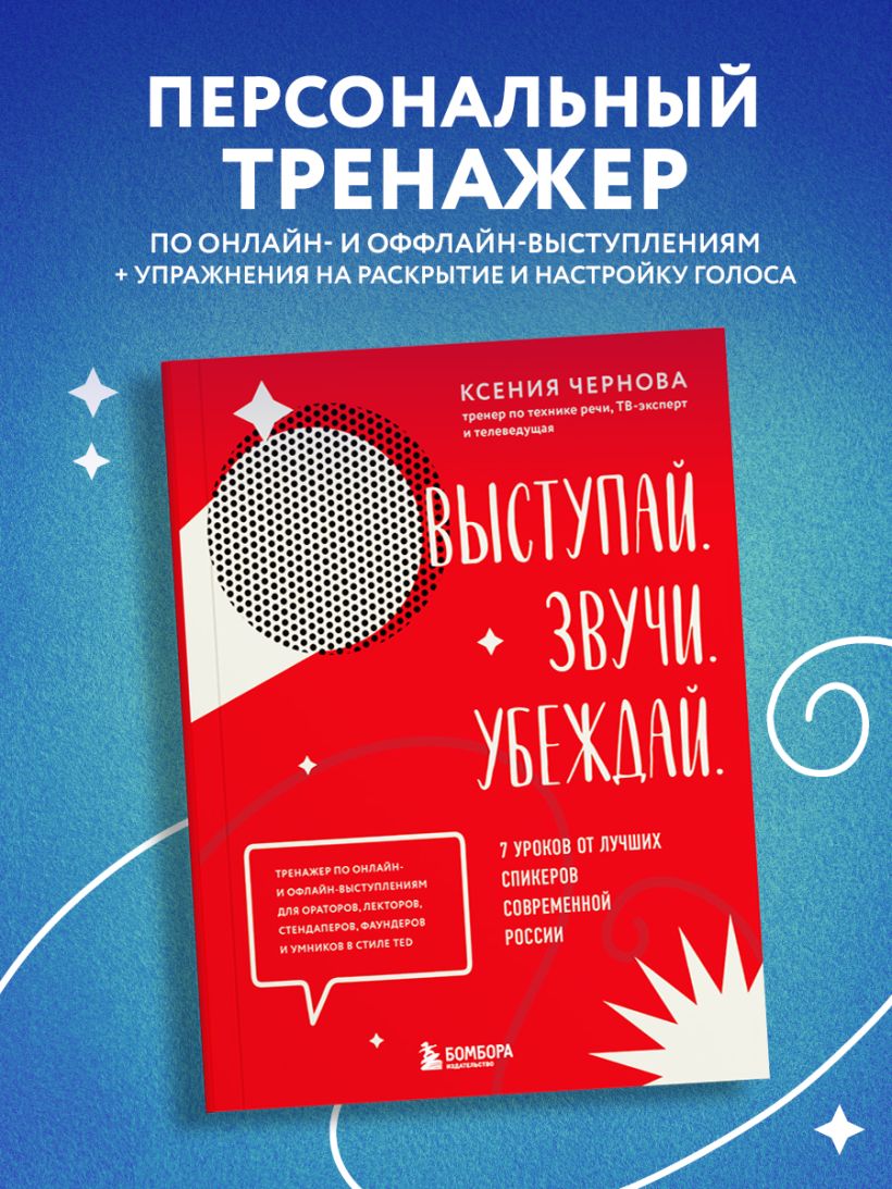 Ксения Чернова — тренер по технике речи и курсов по постановке голоса, более 10 лет успешно готовит к публичным выступлениям и интервью представителей таких компаний, как Rambler&Co, «Газпром нефть», телеканал «Россия 1» и многих других. Ее книга станет вашим персональным тренажером по всем видам онлайн- и оффлайн-выступлений. В ней вы найдете семь уроков от семи лучших спикеров страны, которые делятся собственными методиками подготовки речи, навыками самопрезентации и фишками для удержания внимания самой разной публики.