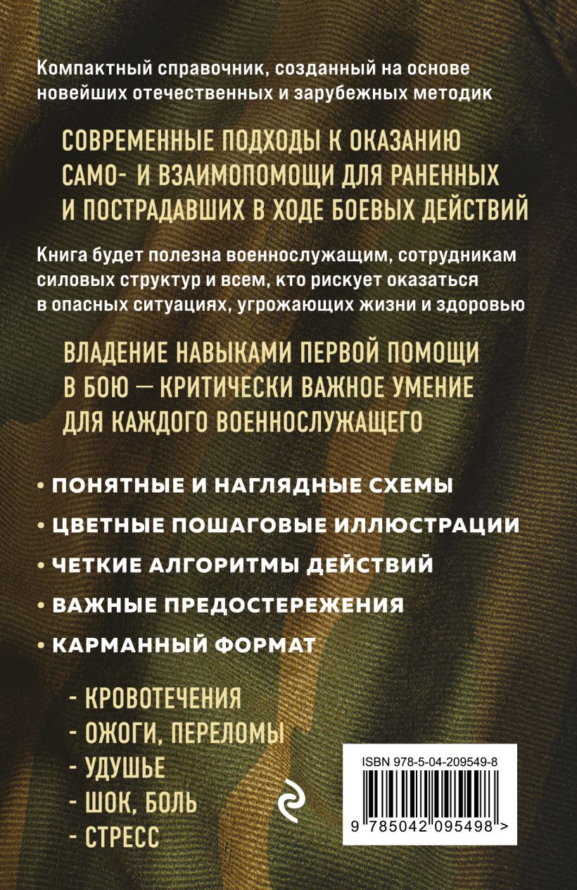 В карманном справочнике изложена современная теория и практика оказания первой помощи раненому и пострадавшему в полевых условиях, учтены актуальные нормативные акты Министерства обороны РФ и других официальных ведомств. Зоны боевого столкновения разделены по степени опасности обстановки, исходя из которых предлагаются определенные действия. Последовательные шаги, правила и средства для оказания помощи описаны в простой и доступной форме. Это руководство поможет сохранить жизнь до получения квалифицированной медицинской помощи и минимизирует риски возможных осложнений.
