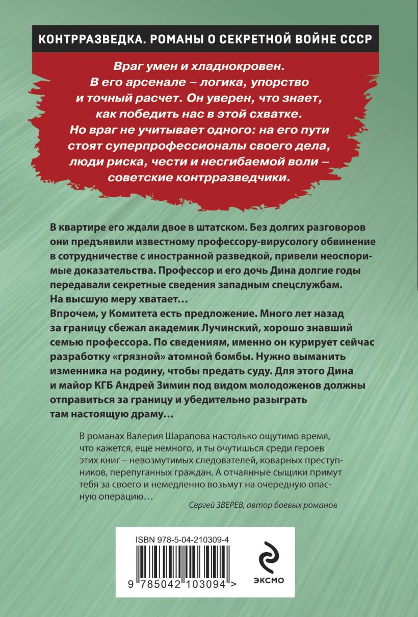 В квартире его ждали двое в штатском. Без долгих разговоров они предъявили известному профессору-вирусологу обвинение в сотрудничестве с иностранной разведкой, привели неоспоримые доказательства. Профессор и его дочь Дина долгие годы передавали секретные сведения западным спецслужбам. На высшую меру хватает… Впрочем, у Комитета есть предложение. Много лет назад за границу сбежал академик Лучинский, хорошо знавший семью профессора. По сведениям, именно он курирует сейчас разработку «грязной» атомной бомбы. Нужно выманить изменника на родину, чтобы предать суду. Для этого Дина и майор КГБ Андрей Зимин под видом молодоженов должны отправиться за границу и убедительно разыграть там настоящую драму…