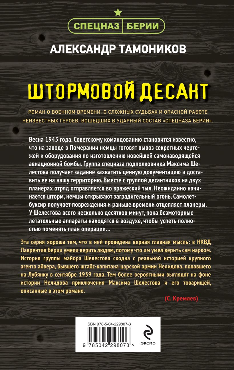 Роман о военном времени, о сложных судьбах и опасной работе неизвестных героев, вошедших в ударный состав «спецназа Берии». 1945 год. Война близится к победному концу. Группа подполковника Максима Шелестова выявляет среди военнопленных морского офицера Бертольда Хофера, имевшего непосредственное отношение к минированию крымского побережья. На допросе немец признается, что после ухода гитлеровцев в Крыму остался отряд диверсантов, готовый в любую минуту совершить подрыв советских объектов. Группа Шелестова выезжает на место, чтобы предотвратить катастрофу. Но в последний момент выясняется, что немецкое командование не доверяло Хоферу и часть проделанной им работы по минированию была отвлекающим маневром. На то, чтобы выяснить точное место и время диверсии, у Максима остаются считаные часы… «Эта серия хороша тем, что в ней проведена верная главная мысль: в НКВД Лаврентия Берии умели верить людям, потому что им умел верить сам нарком. История группы майора Шелестова сходна с реальной историей крупного агента абвера, бывшего штабс-капитана царской армии Нелидова, попавшего на Лубянку в сентябре 1939 года. Тем более вероятными выглядят на фоне истории Нелидова приключения Максима Шелестова и его товарищей, описанные в этом романе». — С. Кремлев Общий тираж книг А. Тамоникова — более 10 миллионов экземпляров.