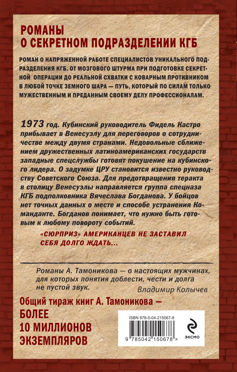 1978 год. «Холодная война» в самом разгаре. В Пакистане, тяготеющем к Западу, завершается строительство современного танкового завода. Это может заметно изменить баланс сил в регионе. Советское руководство принимает решение — уничтожить объект любой ценой. Операция поручена группе спецназа КГБ майора Иваницкого. Однако, перейдя границу, бойцы попадают в ловушку, организованную предателем, и оказываются в секретной тюрьме. Но они не теряют надежды на спасение: поднимают бунт и укрываются в крепостной башне... В Москве становится известно о восстании. На помощь узникам направляется отряд спецназа подполковника Вячеслава Богданова. Найти и освободить товарищей в безлюдной пустыне — задача не из легких. Но опытные бойцы готовы к встрече с любыми обстоятельствами… Роман о напряженной работе специалистов уникального подразделения КГБ. От мозгового штурма при подготовке секретной операции до реальной схватки с коварным противником в любой точке земного шара — путь, который по силам только мужественным и преданным своему делу профессионалам. «Романы А. Тамоникова — о настоящих мужчинах, для которых понятия доблести, чести и долга — не пустой звук». — В. Колычев Общий тираж книг А. Тамоникова — более 10 миллионов экземпляров.