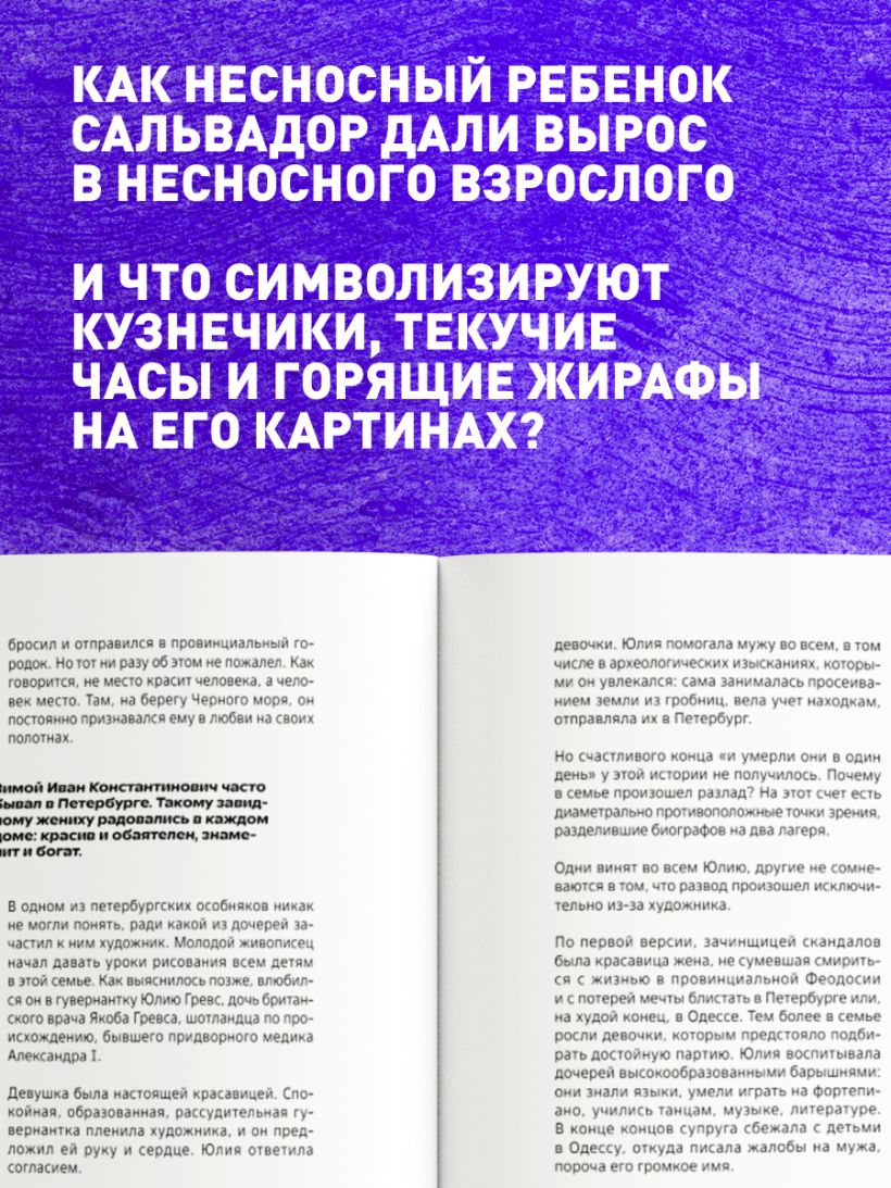 Вы познакомитесь с великим и ужасным Пабло Пикассо — величайшим новатором, ставшим студентом Академии художеств в 13 лет… и кошмаром для своих близких. Проследите за тернистым путем Винсента Ван Гога, который начал рисовать лишь в 27 лет, и узнаете, какая зловещая нить связывает его детство с детством Сальвадора Дали. Откроете темные и светлые стороны русских мастеров: благотворителя и домашнего тирана Ивана Айвазовского, идеалиста Архипа Куинджи, менявшего мир своей добротой, загадочного Михаила Врубеля, всю жизнь боровшегося со своим Демоном.