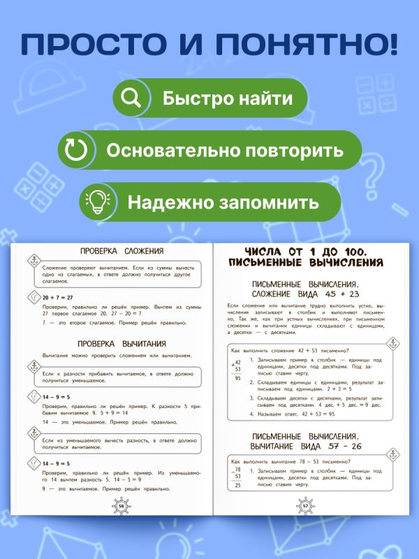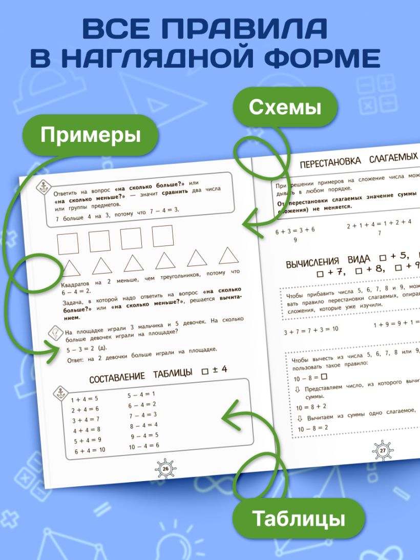 Справочник предназначен для младших школьников, обучающихся по ускоренной трёхлетней программе или по индивидуальному плану, а также для преподавателей, работающих по программе «Эффективная начальная школа». Главное требование к справочникам для учеников начальных классов — краткое и понятное изложение учебного материала. В данном пособии предельно доступно, в виде таблиц, схем, правил и примеров их применения, изложен весь курс математики за 1 класс по программе трёхлетнего обучения. Такая подача материала позволяет быстро найти нужную учебную информацию, основательно повторить и надёжно запомнить её. Современное и удобное в использовании пособие разработано в полном соответствии с требованиями ФГОС начального общего образования.