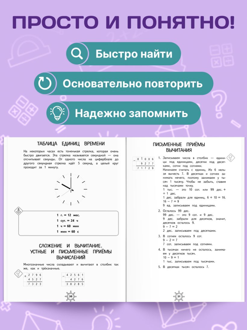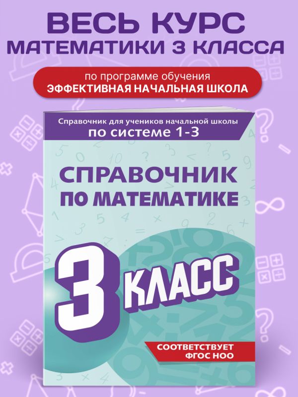 Справочник предназначен для младших школьников, обучающихся по ускоренной трёхлетней программе или по индивидуальному плану, а также для преподавателей, работающих по программе «Эффективная начальная школа». Главное требование к справочникам для учеников начальных классов — краткое и понятное изложение учебного материала. В данном пособии предельно доступно, в виде таблиц, схем, правил и примеров их применения, изложен весь курс математики за 3 класс по программе трёхлетнего обучения. Такая подача материала позволяет быстро найти нужную учебную информацию, основательно повторить и надёжно запомнить её. Современное и удобное в использовании пособие разработано в полном соответствии с требованиями ФГОС начального общего образования.