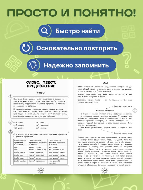 Справочник предназначен для младших школьников, обучающихся по ускоренной трёхлетней программе или по индивидуальному плану, а также для преподавателей, работающих по программе «Эффективная начальная школа». Главное требование к справочникам для учеников начальных классов — краткое и понятное изложение учебного материала. В данном пособии предельно доступно, в виде таблиц, схем, правил и примеров их применения, изложен весь курс русского языка за 3 класс по программе трёхлетнего обучения. Такая подача материала позволяет быстро найти нужную учебную информацию, основательно повторить и надёжно запомнить её. Современное и удобное в использовании пособие разработано в полном соответствии с требованиями ФГОС начального общего образования.