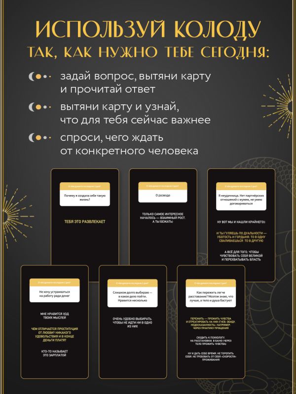 ⁃ Задать свой вопрос и вытянуть карту. Вопрос на карте может отличаться от твоего. Но ответ — точно будет для тебя.