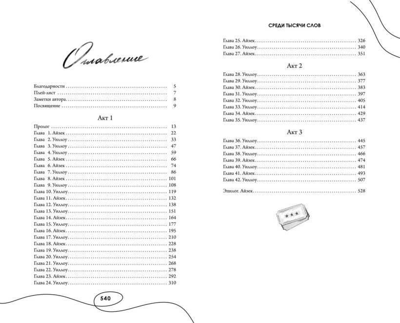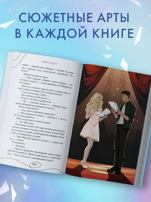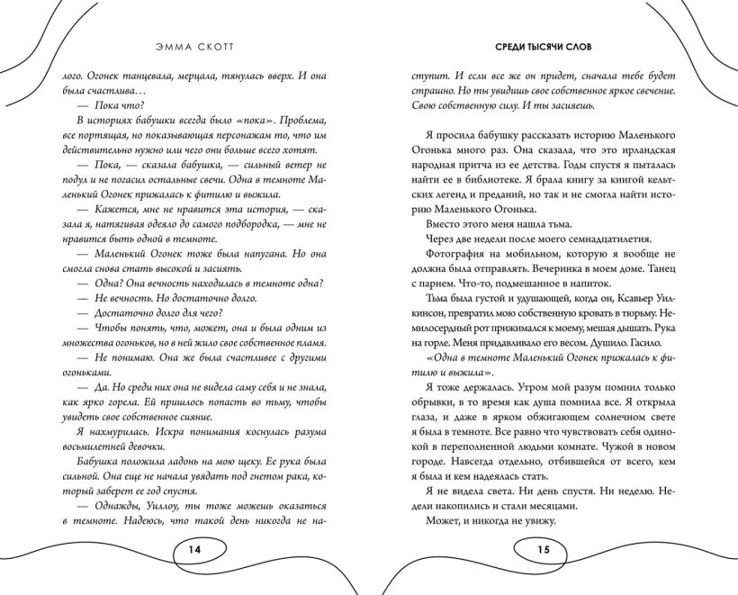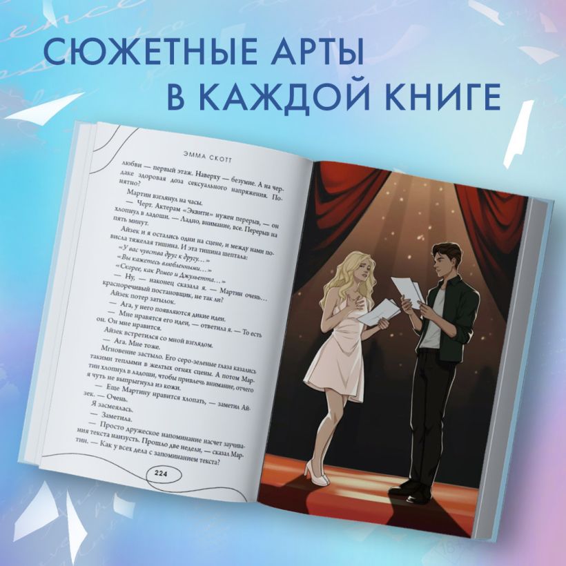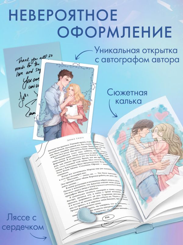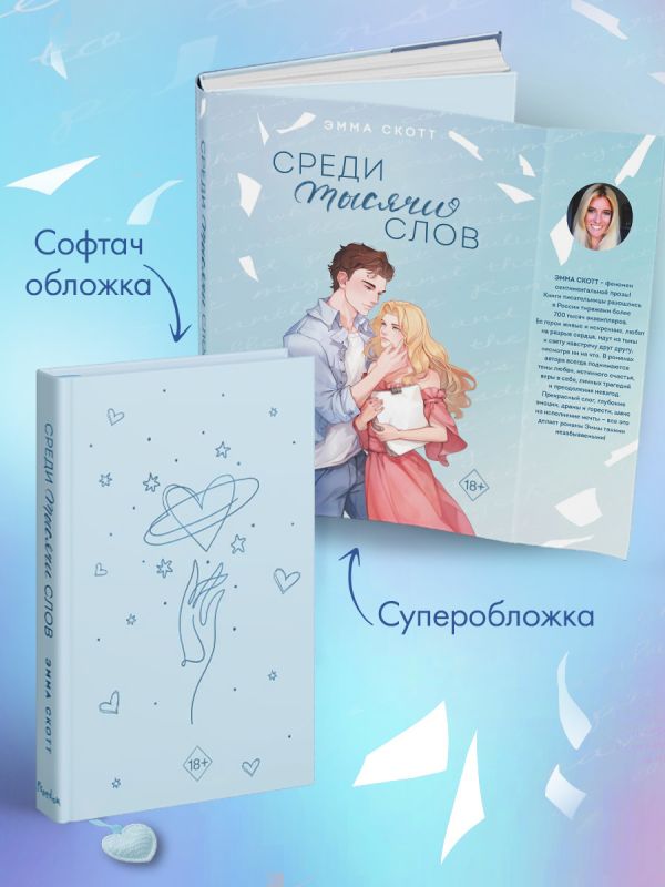 Уникальное подарочное оформление книги Эммы Скотт «Среди тысячи слов»: издание с софттач обложкой с тиснением фольгой, софттач суперобложкой с лаком, тремя цветными вклейками с артами персонажей, сюжетной страницей, ляссе с сердечком и цветной открыткой с автографом автора! Иллюстрация на суперобложке создана художницей eluvianart, внутренние иллюстрации — художницей Кирой Мори.