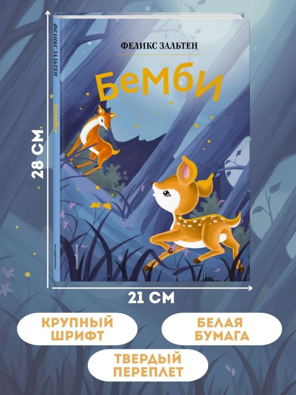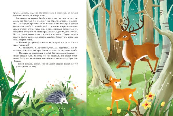 Это сказка о взрослении олененка, чувства и эмоции которого будут понятны малышам, ведь в них так легко увидеть свои. Бемби также проходит через трудности и страхи и учится быть сильным несмотря ни на что.