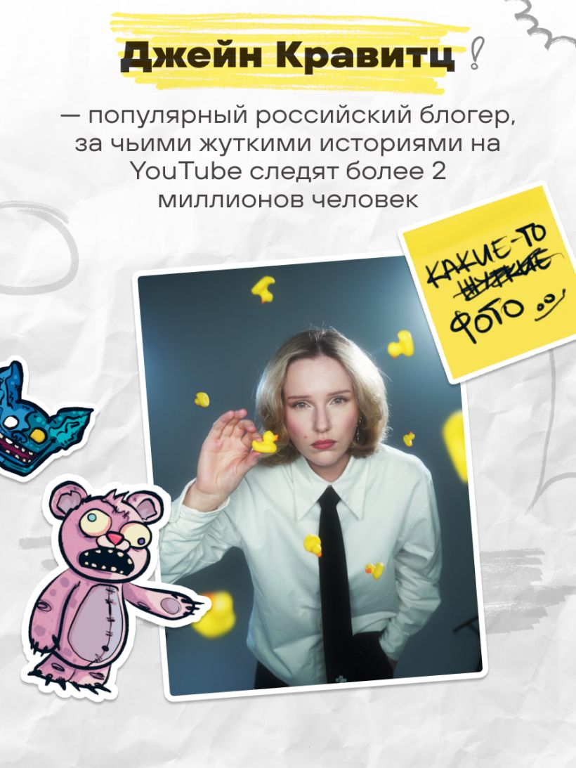 Забыла представиться, это Джейн Кравитц, и я рассказываю жуткие реальные истории на своём YouTube-канале. Всё, теперь можете открывать стикербук.