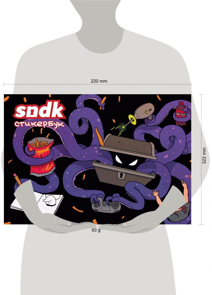 У данного альбома есть концепция. Это многогранность, к которой я стремлюсь при работе над sndk.tv. Живой сундук стал талисманом канала неспроста: он доверху наполнен ништяками на любой вкус, а его щупальца пытаются охватить всё больше интересных тем и форматов. Чтобы выразить это в рамках стикербука, на мой взгляд, не было варианта лучше, чем создать его в сотрудничестве с тусовкой талантливых отечественных художников.