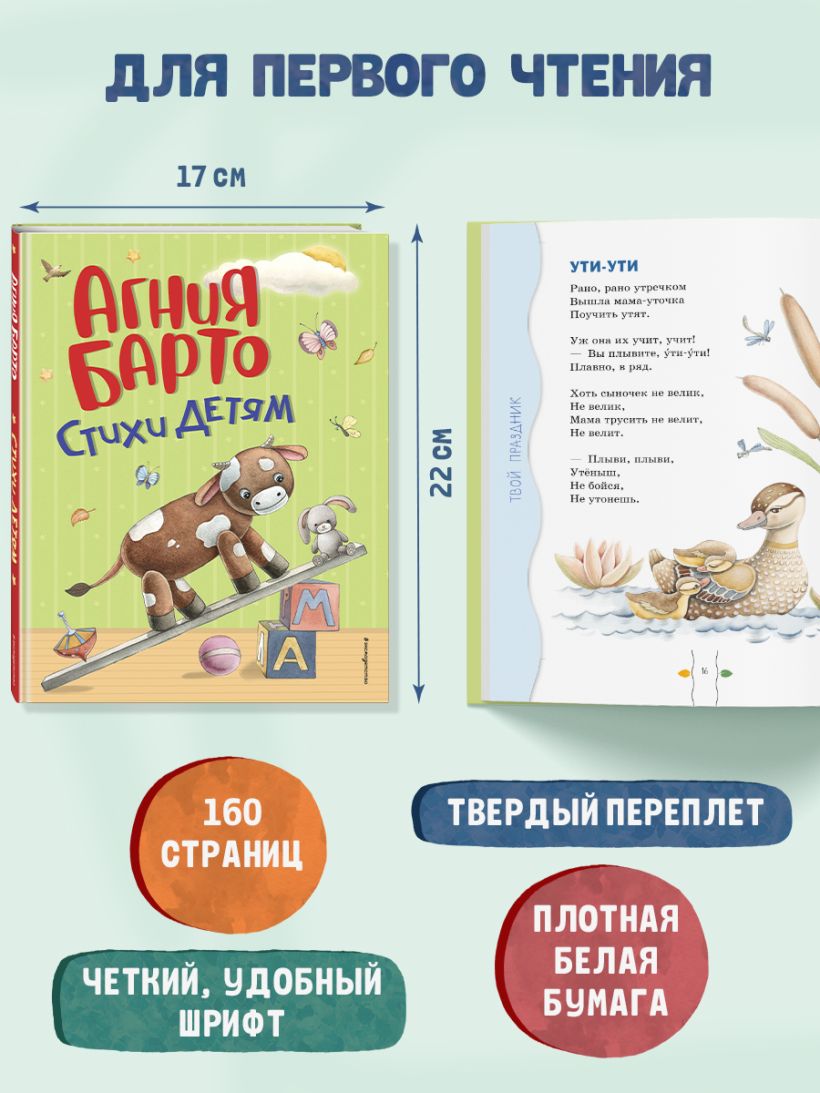- Самые известные стихотворения Агнии Барто в одной книге! - Твёрдый переплёт, яркое оформление, добрые иллюстрации известной художницы Анны Ильченко. - Лёгкие книги удобного формата, которые малышу удобно рассматривать самостоятельно. - Любимые произведения для чтения с рождения. Стихотворения Агнии Барто — классика, на которой выросло не одно поколение детей. Звонкий смех, льющийся со строк; меткие фразы, которые вспоминаются и через много лет; общение взрослого на языке ребёнка — вот формула, что помогает автору привносить самое-самое в ум и сердце каждого мальчика и каждой девочки. Стихотворения Агнии Львовны будут сопровождать малыша на протяжении его взросления, а герои добрых произведений станут надёжными друзьями каждого ребёнка и помогут в раннем детстве воспитать лучшие душевные качества.