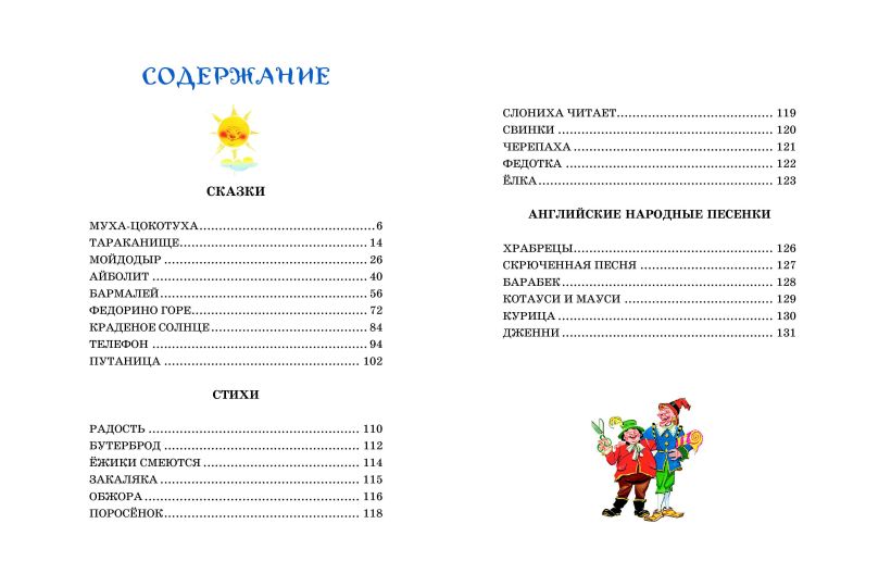 В сборник вошло 9 сказок («Тараканище», «Айболит», «Бармалей», «Телефон» и другие), 11 стихотворений («Радость», «Бутерброд», «Ёжики смеются», «Закаляка» и другие), 6 английских народных песенок («Храбрецы», «Барабек», «Курица», «Дженни» и другие).