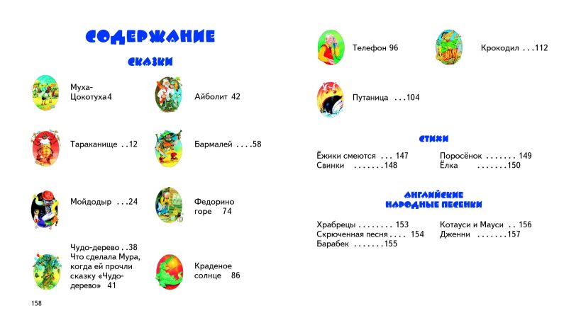 В сборник вошло 12 сказок («Муха-цокотуха», «Тараканище», «Айболит» и другие), 4 стихотворения («Ёжики смеются», «Свинки», «Поросёнок», «Ёлка») и 5 английских народных песенок («Храбрецы», «Дженни», «Барабек» и другие).