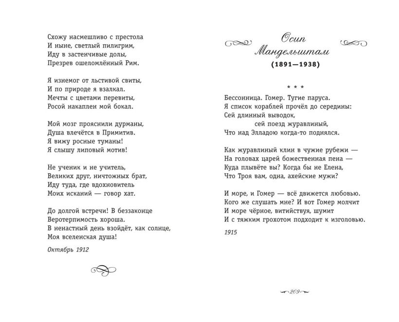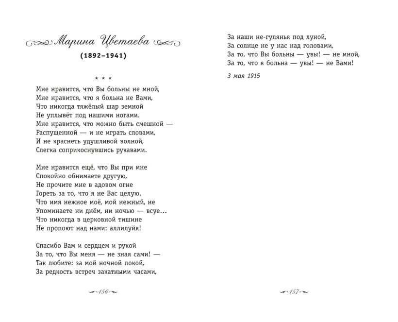 В сборник вошли стихотворения поэтов Серебряного века. Этот период охватывает конец XIX — начало XX века и считается в русской литературе эпохой свободы. Молодые поэты: Александр Блок, Николай Гумилев, Борис Пастернак, Сергей Есенин говорили о своих чувствах куда откровеннее, нежели их предшественники. А еще одной приметой времени стало появление поэтов — женщин: Анны Ахматовой, Марины Цветаевой, Надежды Тэффи, Зинаиды Гиппиус… Впервые поэзия обрела женский голос и заговорила о глубоко личном, не стыдясь упоминания бытовых деталей.