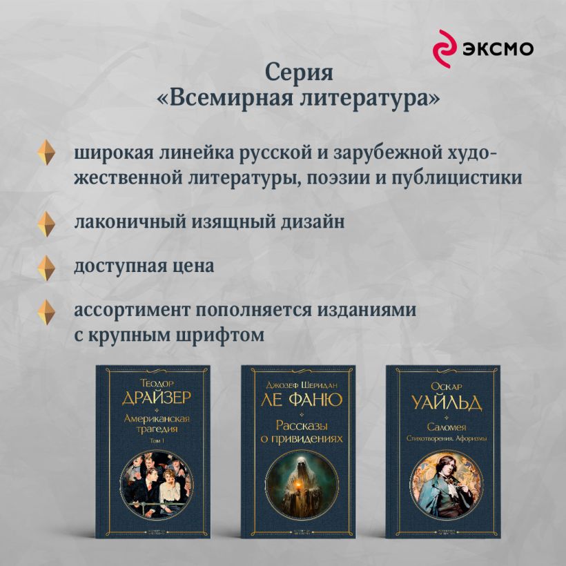 «Американская трагедия» — вершина творчества Теодора Драйзера, писателя, внесшего весомый вклад в национальную литературу Америки. С одной стороны, это история о коррупции общества и крахе молодого американца Клайда Грифитса, готового пойти на преступление в отчаянной погоне за успехом. В то же время на более глубоких уровнях романа раскрывается масштабное изображение действительности, ценности которой питают амбиции Клайда и приводят его к трагедии. Непревзойденное изображение суровой реальности и темной стороны американской мечты, исключительное по силе и размаху, не оставляет равнодушным уже несколько поколений читателей.