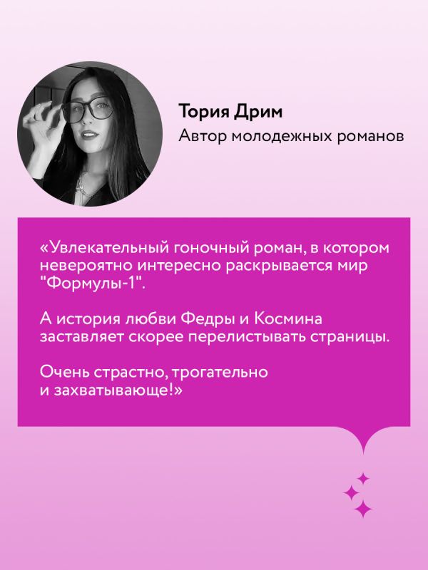 «Увлекательный гоночный роман, в котором невероятно интересно раскрывается мир "Формулы-1". А история любви Федры и Космина заставляет скорее перелистывать страницы. Очень страстно, трогательно и захватывающе!» – Тория Дрим, автор молодежных романов