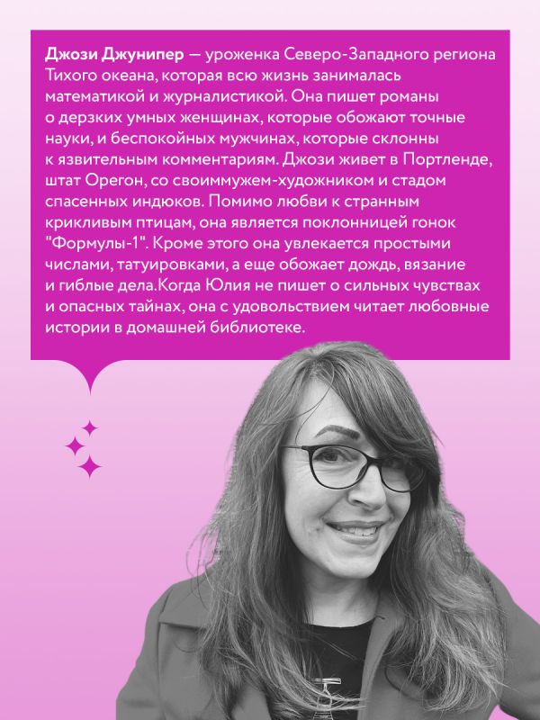 Джози Джунипер — уроженка Северо-Западного региона Тихого океана, которая всю жизнь занималась математикой и журналистикой. Она пишет романы о дерзких умных женщинах, которые обожают точные науки, и беспокойных мужчинах, которые склонны к язвительным комментариям. Джози живет в Портленде, штат Орегон, со своим мужем-художником и стадом спасенных индюков. Помимо любви к странным крикливым птицам, она является поклонницей гонок "Формулы-1". Кроме этого она увлекается простыми числами, татуировками, а еще обожает дождь, вязание и гиблые дела.