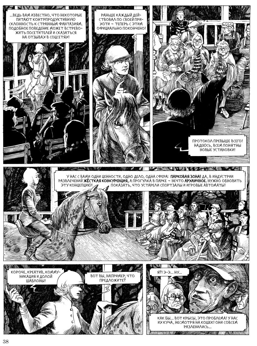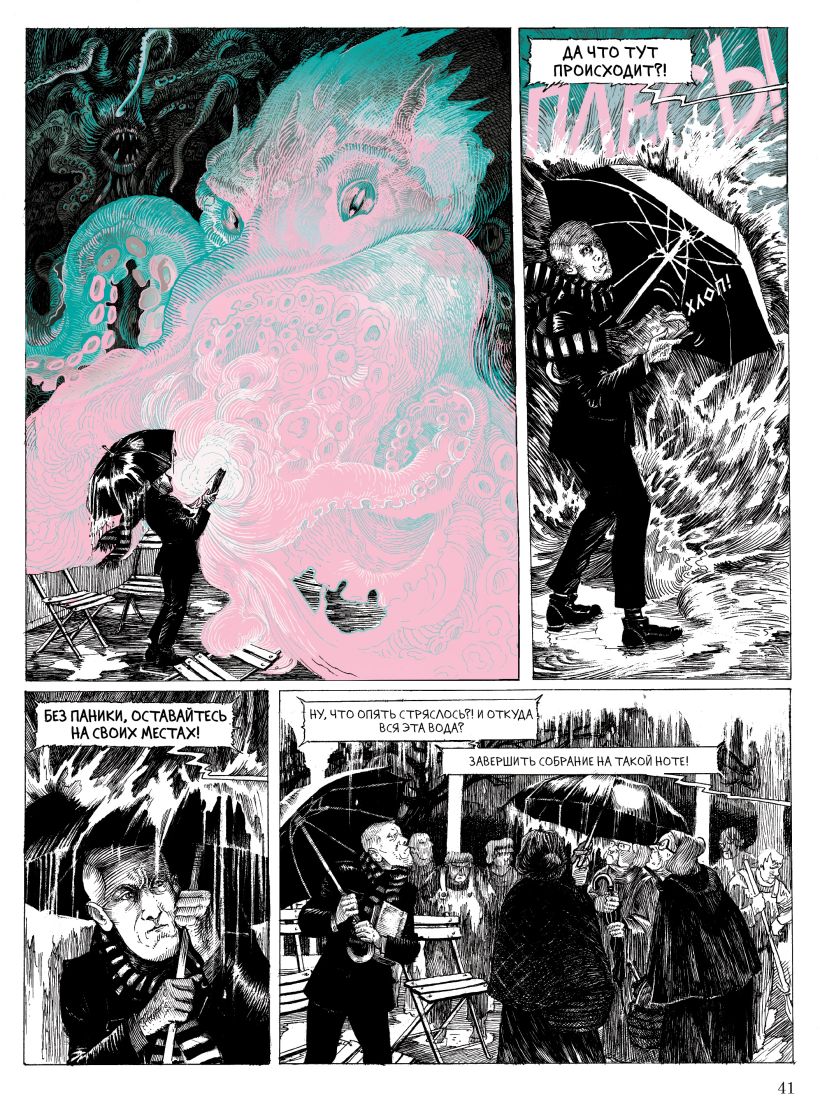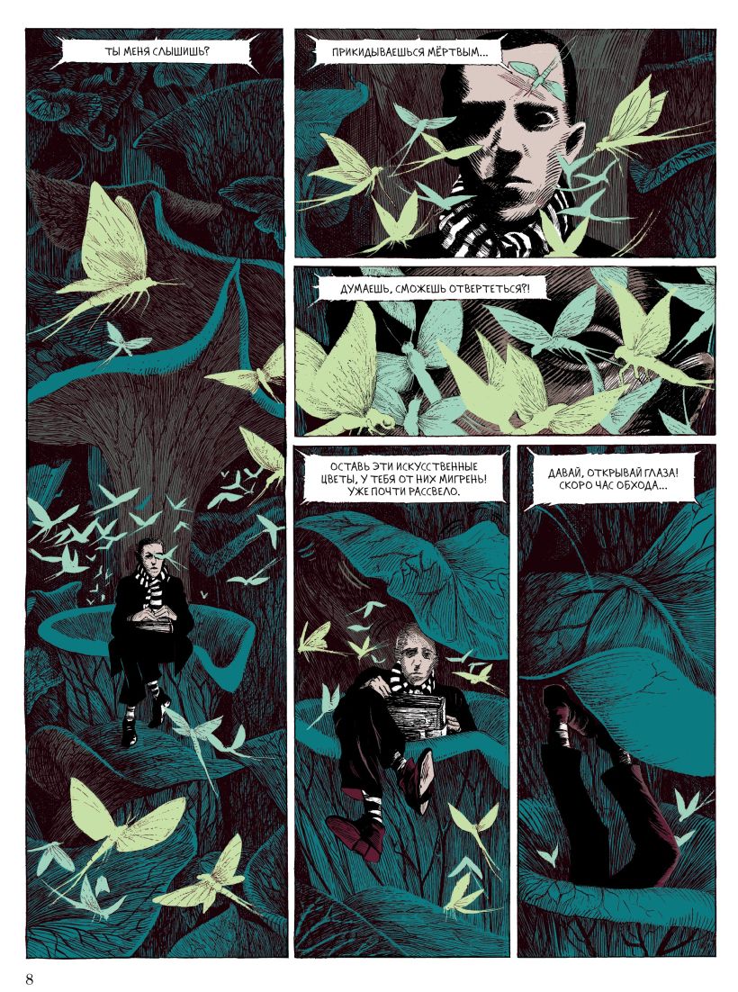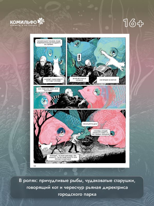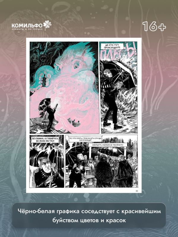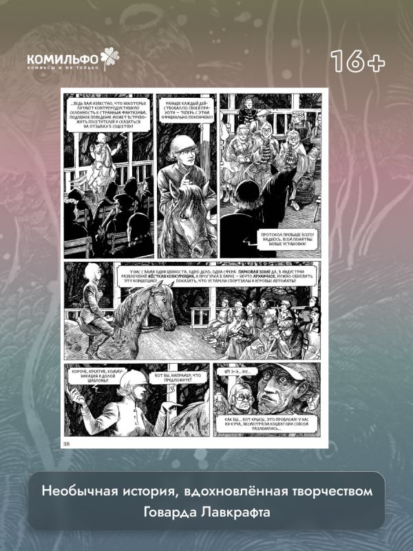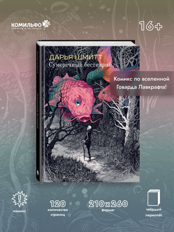 Сочетая юмор абсурда и виртуозную графику, Дарья Шмитт погружает читателя в мир Лавкрафта, чтобы в фантастической и поэтичной манере почтить память мэтра ужасов. Заворожённый кошмарными видениями, смотритель парка приглашает нас вглядеться в сумерки, чтобы различить там ужасы и чудеса, недоступные глазу простого смертного.
