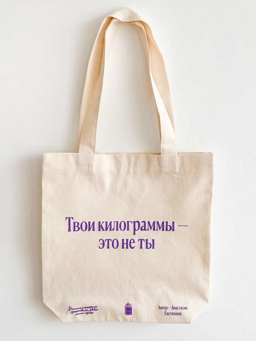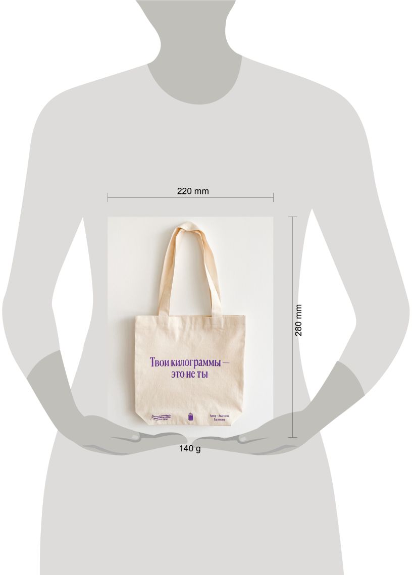 Хлопковая сумка-шоппер «Твои килограммы — это не ты» от издательства Popcorn Books с прямоугольным дном. Вмещает формат А4. Сумка выдерживает вес до 10 кг. Размер: 36 × 37 см, длина ручек — 35 см.