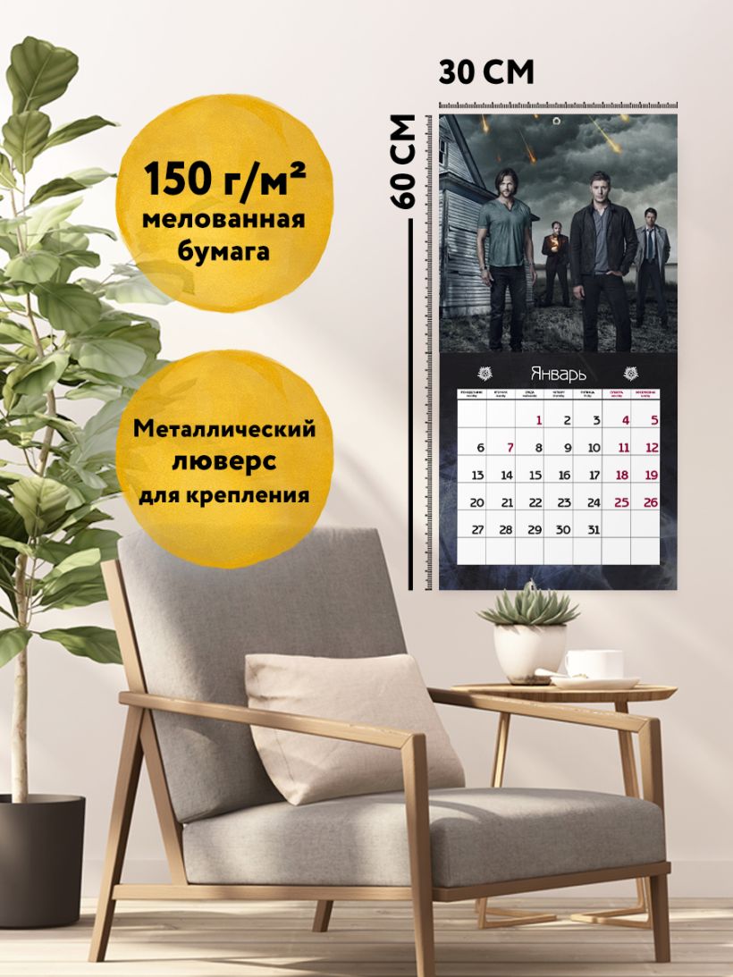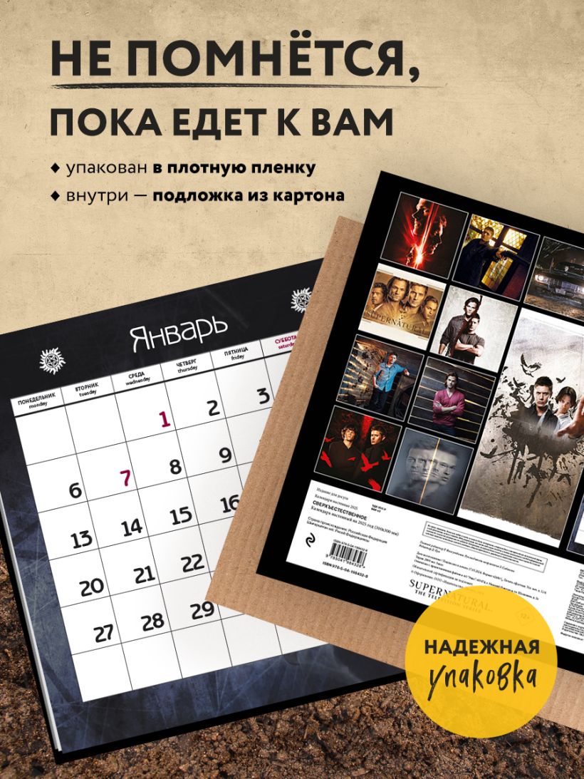 Календарь с 12 любимыми кадрами из сериала «Сверхъестественное»! Отличное полиграфическое исполнение и удобная сетка, в которой отмечены все государственные праздники — все это будет дарить вам такие незабываемые эмоции каждый день, что вы не заметите, как пролетит целый год! Сэм, Дин, Кас, Кроули, Бобби и остальные ждут вас внутри! Отличный подарок себе и друзьям!