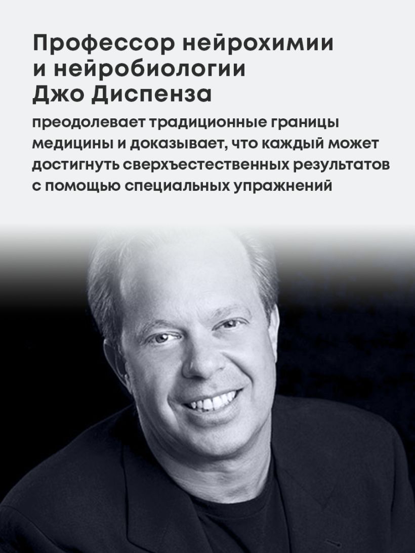 Доктор Диспенза — профессор нейрохимии и нейробиологии, руководитель клиники интегрированной медицины. Автор мировых бестселлеров по развитию мозга. Джо Диспенза выступает с мастер-классами в 26 странах на пяти континентах. Он обучил тысячи людей, как перенастроить свой мозг и тело, чтобы улучшить здоровье и жизнь. Диспенза — первый автор, которому удалось понятно, доступно и на научном языке объяснить работу подсознания.