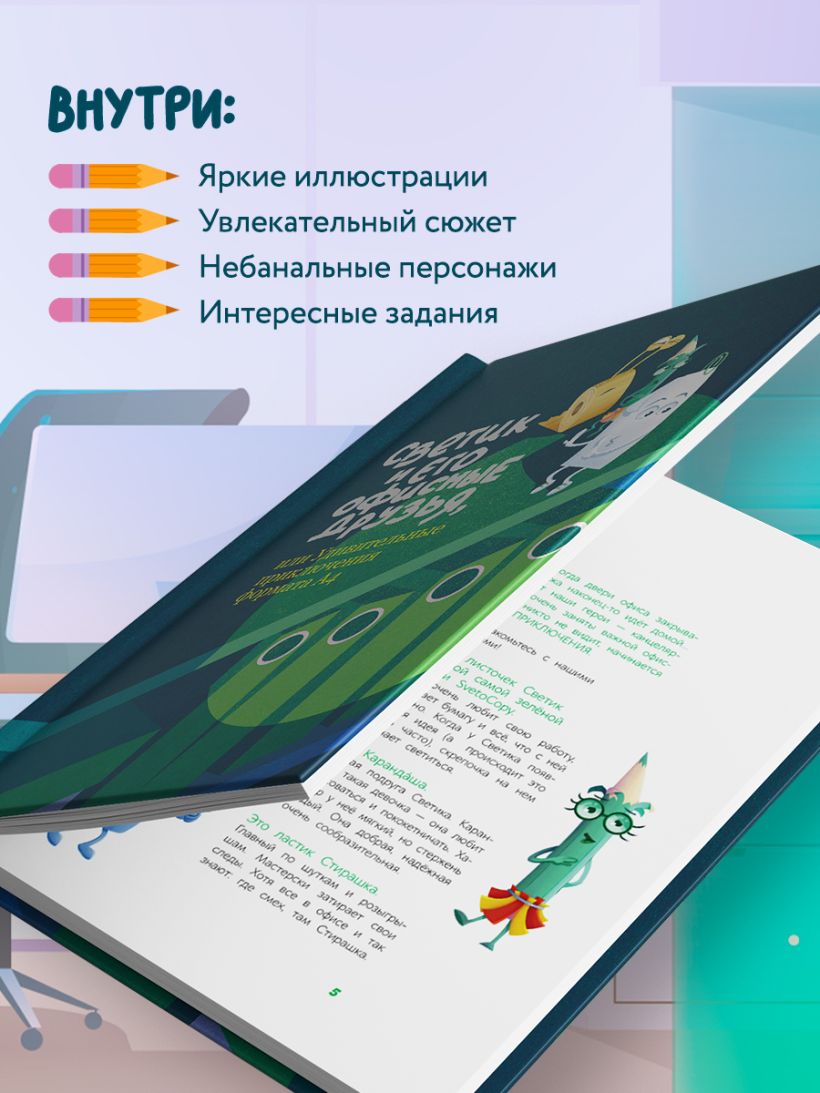 Захватывающая детская история с яркими иллюстрациями и необычными героями: листочком Светиком, ластиком Стирашкой, планшетом Планшуриком и другими офисными обитателями. Днем они заняты важной работой, а ночью, когда никто не видит, начинают свои приключения…