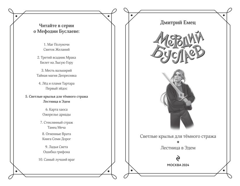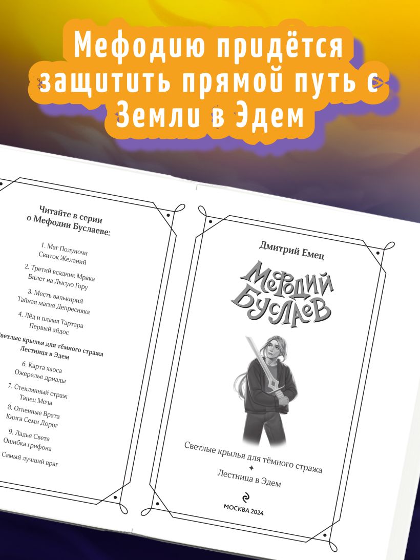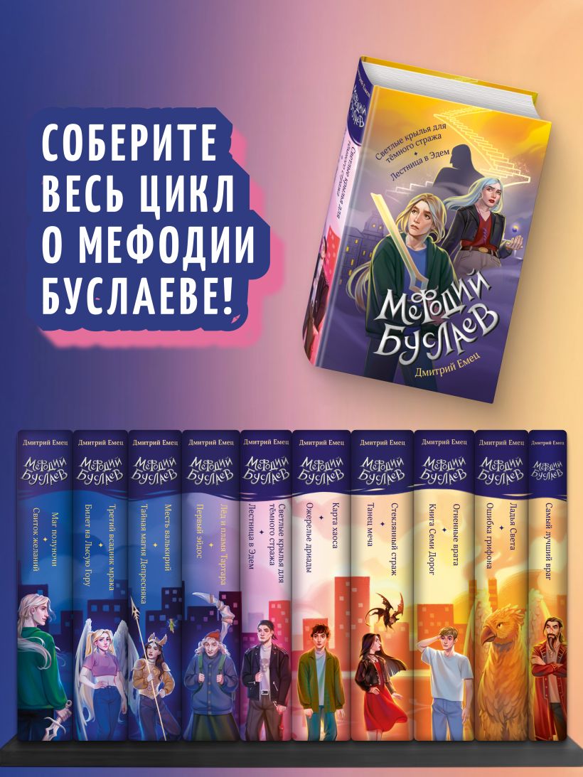 Одна книга — две истории знаменитого российского писателя Дмитрия Емца о приключениях «Мефодия Буслаева» — «Светлые крылья для тёмного стража» и «Лестница в Эдем»!