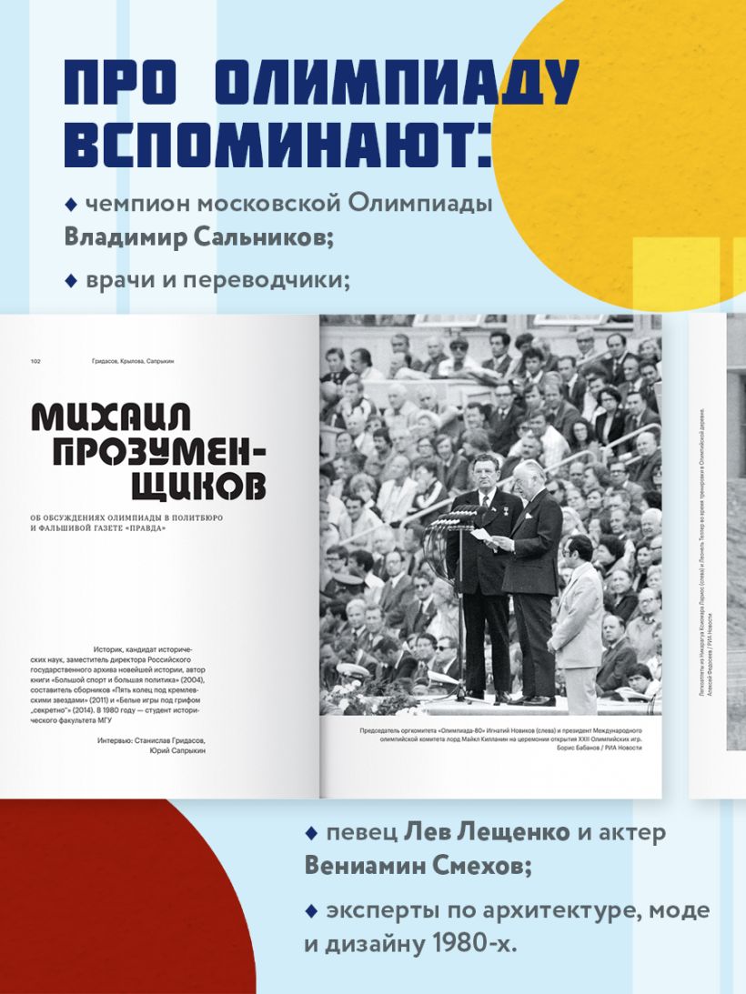 Москва засуетилась, затрепетала в ожидании гостей со всего мира. Велотрек в Крылатском и гостиница «Космос», пепси-кола и кроссовки Adidas, улетающий в небо Мишка и песня «На трибунах становится тише» — всё это появилось в нашей жизни благодаря Олимпиаде-80. Первые Игры в Восточной Европе, крупнейший международный праздник в СССР, по всем параметрам, московская Олимпиада — явление историческое. Так получилось, что с ней совпали еще несколько масштабных событий, изменивших ход истории: ввод войск в Афганистан, смерть Высоцкого, новый виток «холодной войны», начало которому положил бойкот Игр со стороны США.