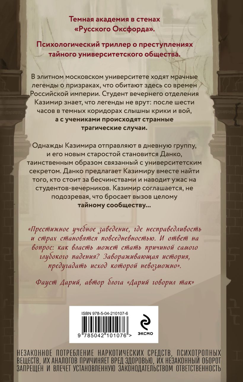 В элитном московском университете ходят мрачные легенды о призраках, что обитают здесь со времен Российской империи. Студент вечернего отделения Казимир знает, что легенды не врут: после шести часов в темных коридорах слышны крики и вой, а с учениками происходят странные трагические случаи.