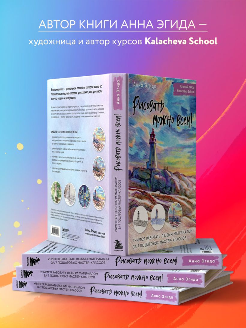 «Рисовать можно всем!» — новая книга от художницы, преподавательницы и автора курсов Kalacheva School Анны Эгиды. В ней она расскажет, как просто освоить алгоритм работы любым материалом, чтобы каждый смог рисовать то, что хочет.