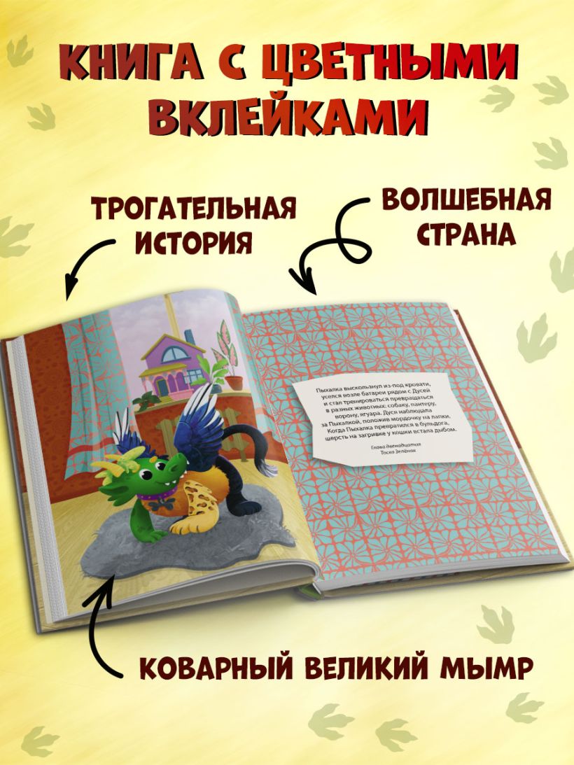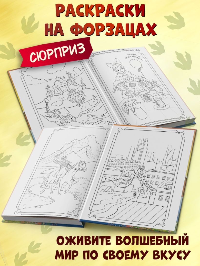 ИНТЕРАКТИВ — РАСКРАСКИ НА ФОРЗАЦАХ! Форзацы книги — это не просто страницы, а настоящее поле для творчества. Дайте волю воображению — раскрасьте четыре сказочные сцены и оживите волшебный мир дракончика Пыхалки по своему вкусу!